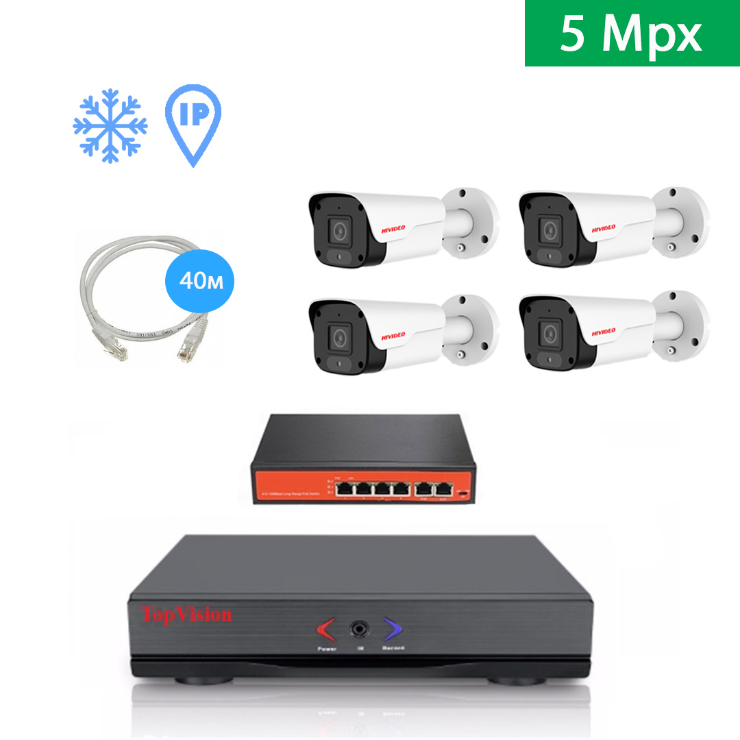 Полностью готовый к установке комплект видеонаблюдения, включает в себя все необходимое оборудование для самостоятельного монтажа, включая жесткий диск. IP видеорегистратор марки TopVision позволяет удаленно просматривать видео и смотреть архив записей из любого места в мире, где есть интернет. Современные IP видеокамеры ведут съемку в разрешении 5mpx и гарантируют высокое качество картинки как днем, так и ночью.